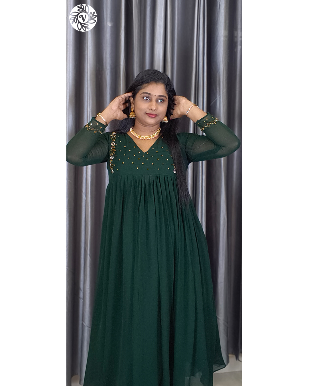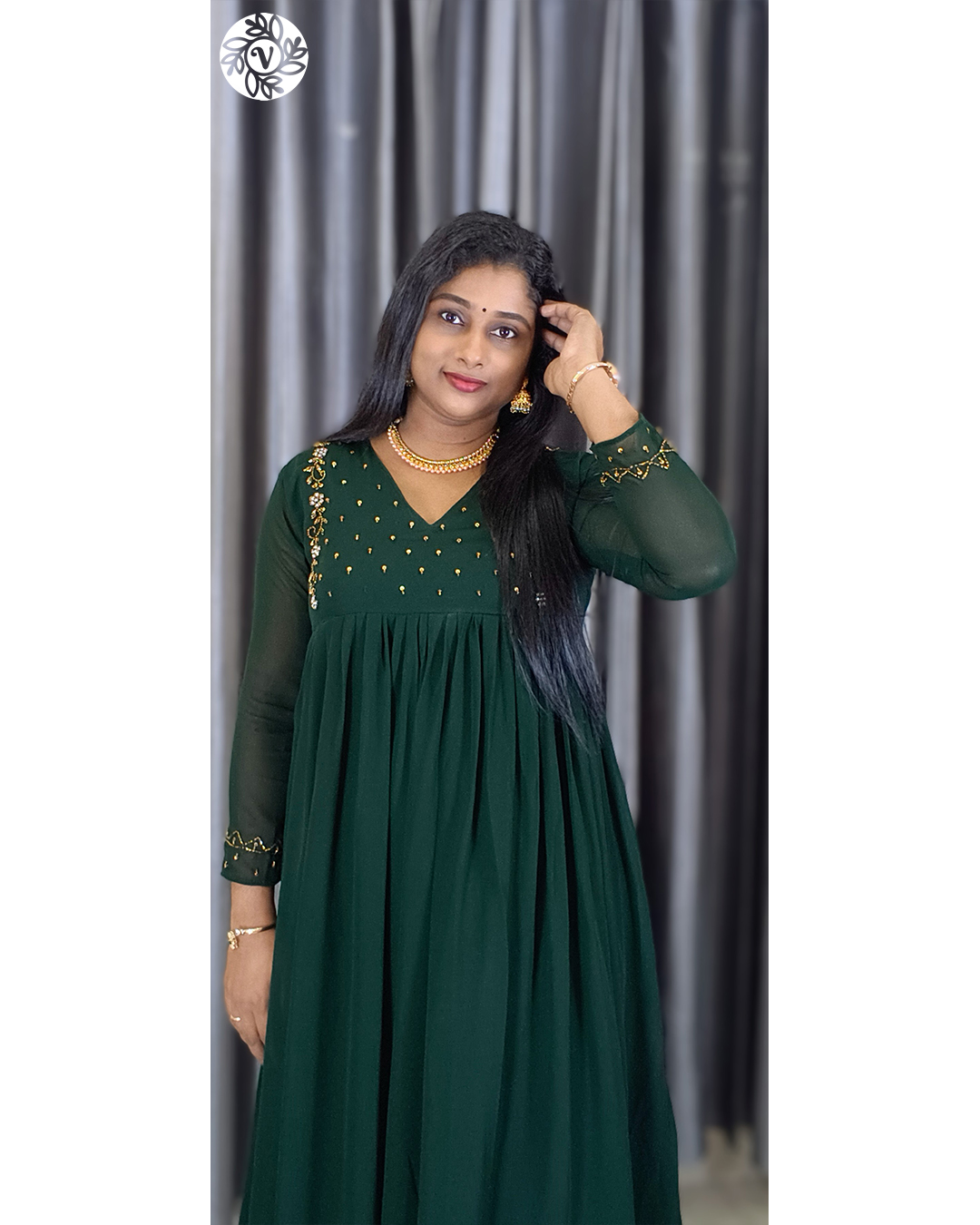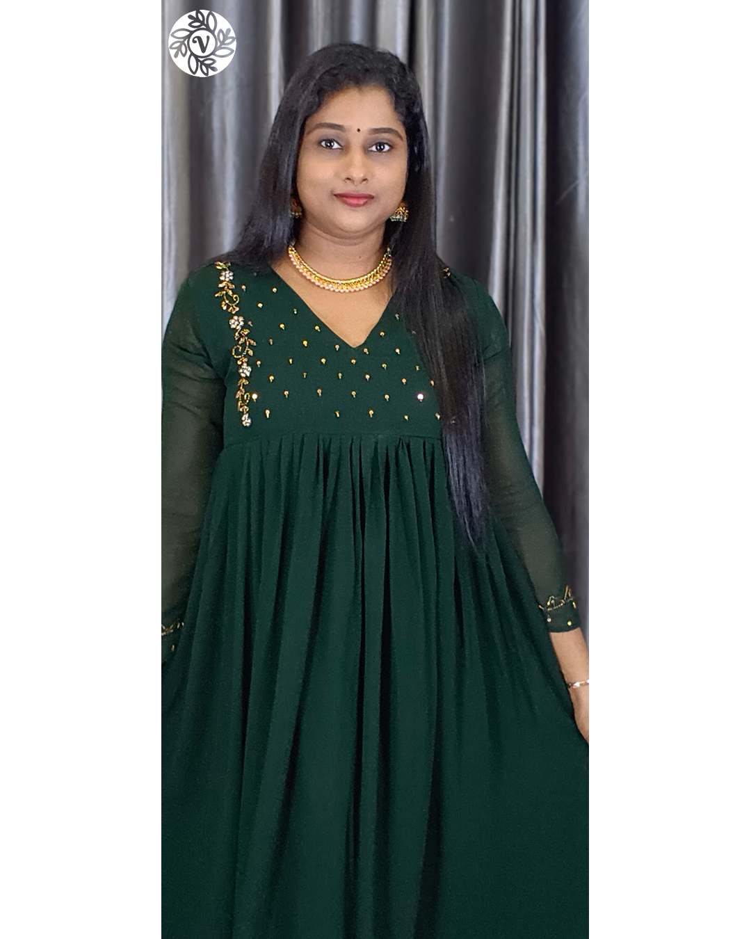 If you want a kurti that stays cool in Kerala’s humidity and still looks refined all day, the Georgette A-Line Kurti (VB 5279) is a smart, everyday choice. The Bottle Green colour reads elegant without being loud, and the thoughtful tailoring—A-line front, back A-line shaping, a soft central pleat, and a clean V-neck—keeps the silhouette sleek while giving you room to move. From office corridors in Kochi and classes in Thiruvananthapuram to café plans in Kozhikode, Thrissur, and Palakkad, this piece slips into your week with minimal styling. Add straight pants or palazzos, simple earrings, and flats or low heels—done in minutes.